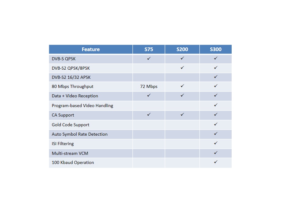 | S200-Pro | Performs all of the functions of the S200, plus enables the reception of raw MPEG PID's and the distribution of the MPEG PID's onto your LAN. The S200-Pro has custom features that enable you to group related PID's together (such as Video and Audio PIDs). This makes the S200-Pro ideally suited for IPTV applications. The S200-Pro also supports optional DVB-standard BISS Mode 1 Fixed Key Conditional Access. |